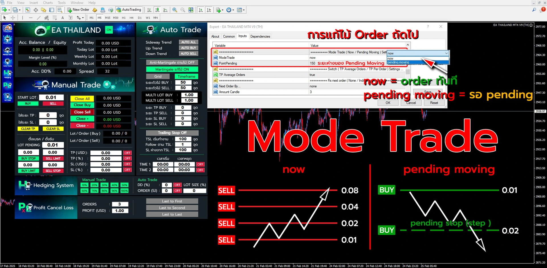 Mode Trade คือ การตั้งค่ารูปแบบการเปิดออเดอร์ ซึ่งสามารถเลือกได้ระหว่าง การเปิดออเดอร์ทันที (Now) และ การตั้งออเดอร์ล่วงหน้า (Pending Moving) โดยสามารถกำหนดค่าได้ในส่วนของ Mode Trade