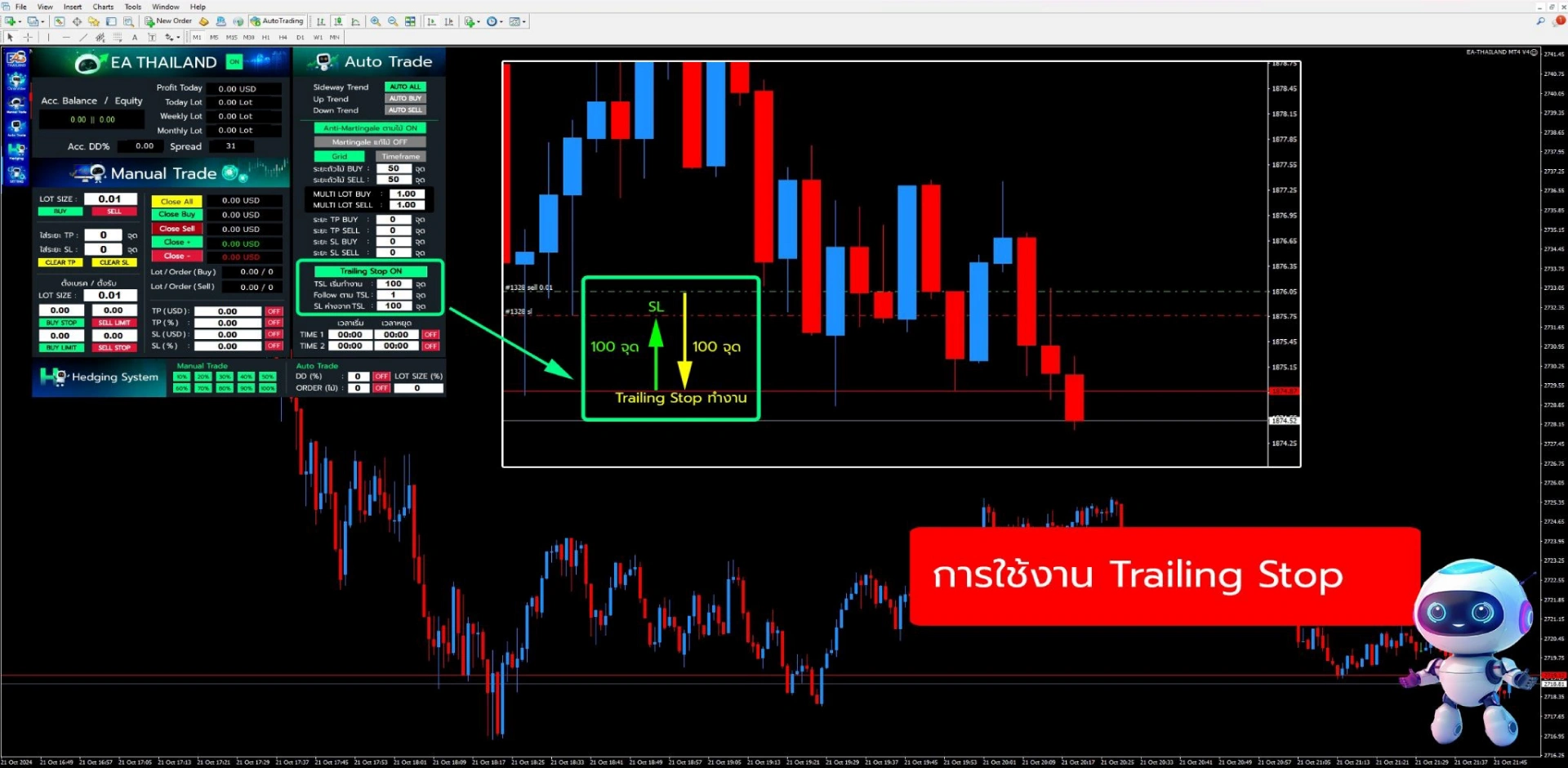 Trailing Stop คือ ระบบช่วยควบคุมความเสี่ยง โดยล็อกกำไรอัตโนมัติเมื่อราคาขยับไปในทิศทางที่ต้องการ โดยจะเลื่อนจุด Stop Loss (SL) ตามราคาที่เพิ่มขึ้นหรือลดลงตามเงื่อนไขที่ตั้งไว้ หากราคากลับตัวและชน Trailing Stop ออเดอร์จะปิดทันที ทำให้สามารถรักษากำไรบางส่วนไว้ได้ แทนที่จะรอให้ราคาย้อนกลับมาขาดทุนทั้งหมด